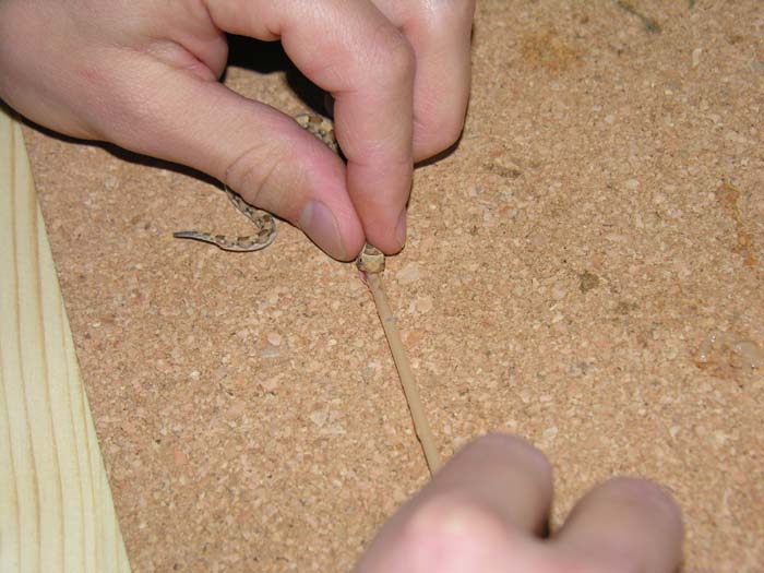 When feeding the juvanile is placed between 2 soft materials such as a pillow or some sponge and slight pressure applied to keep the snake in position. When feeding pinkies, a small part of the pinky such as a hind leg is cut off, dipped in water and gently placed in the back of the snake's throat and then any grip on the snake is released. Now wait to see if it swallows. If it spits the food out, try again until it swallows. After it has successfully swallowed, the next feed it is teased with the food item to see if it takes before having to subdue it as above. As they grow they are fed larger portions until they are taking whole pinkies.